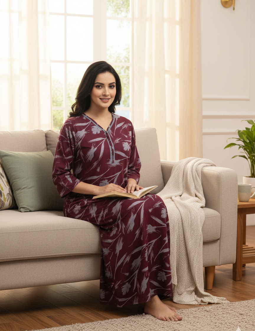Indulge in the luxurious comfort of our Silken Drape Premium Rayon Nighty. This full-length nightdress is crafted from high-quality premium rayon fabric, known for its buttery-soft feel and elegant, flowing drape that is supremely comfortable for sleeping and lounging.
