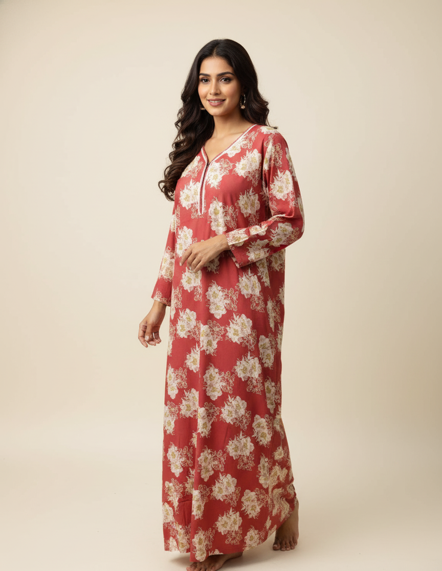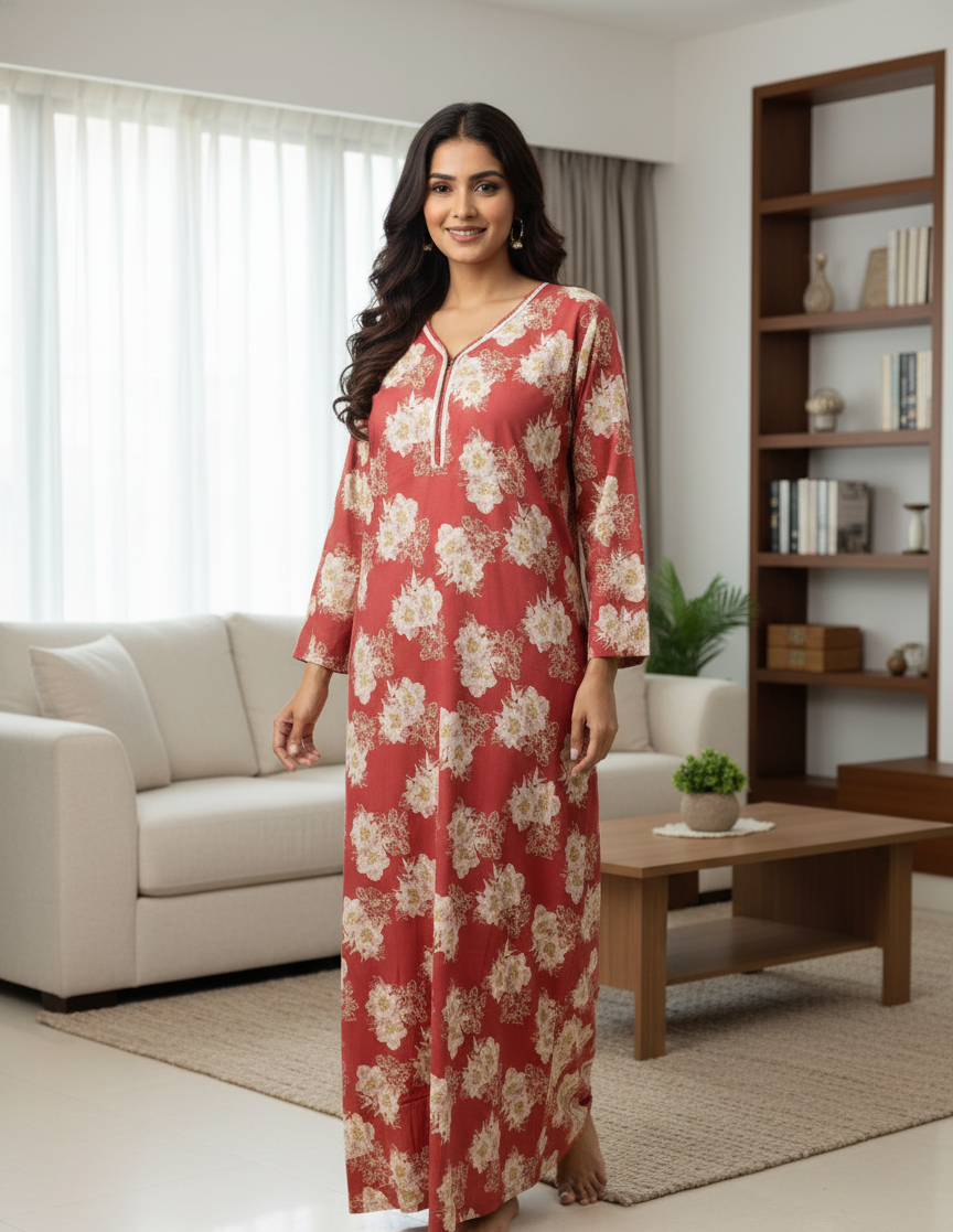 - Design: This full-length maxi nighty features a comfortable kaftan-style fit that allows for unrestricted movement. The charming floral print adds a touch of sophistication, making it suitable for both sleeping and lounging at home.