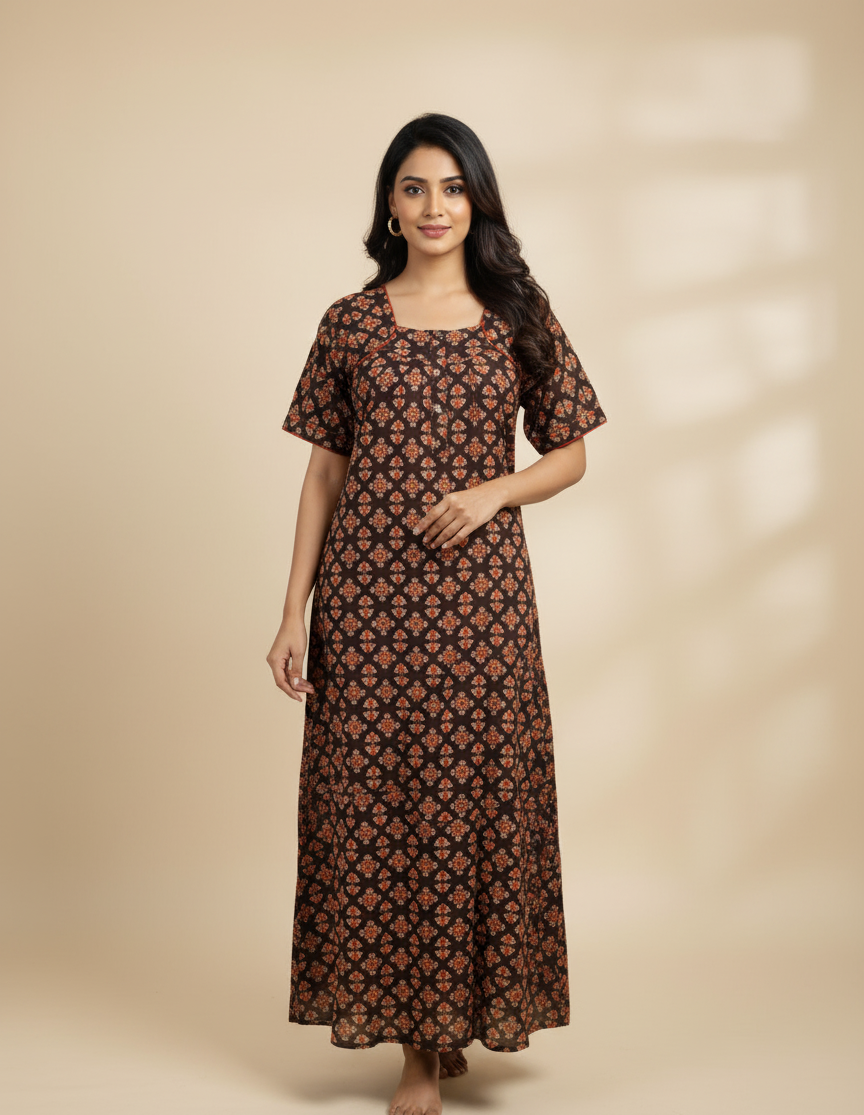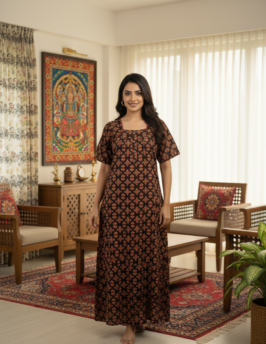 Drift off in style with our exquisite Ajrak Print Nighty, a perfect blend of traditional Indian handblock printing and modern comfort.